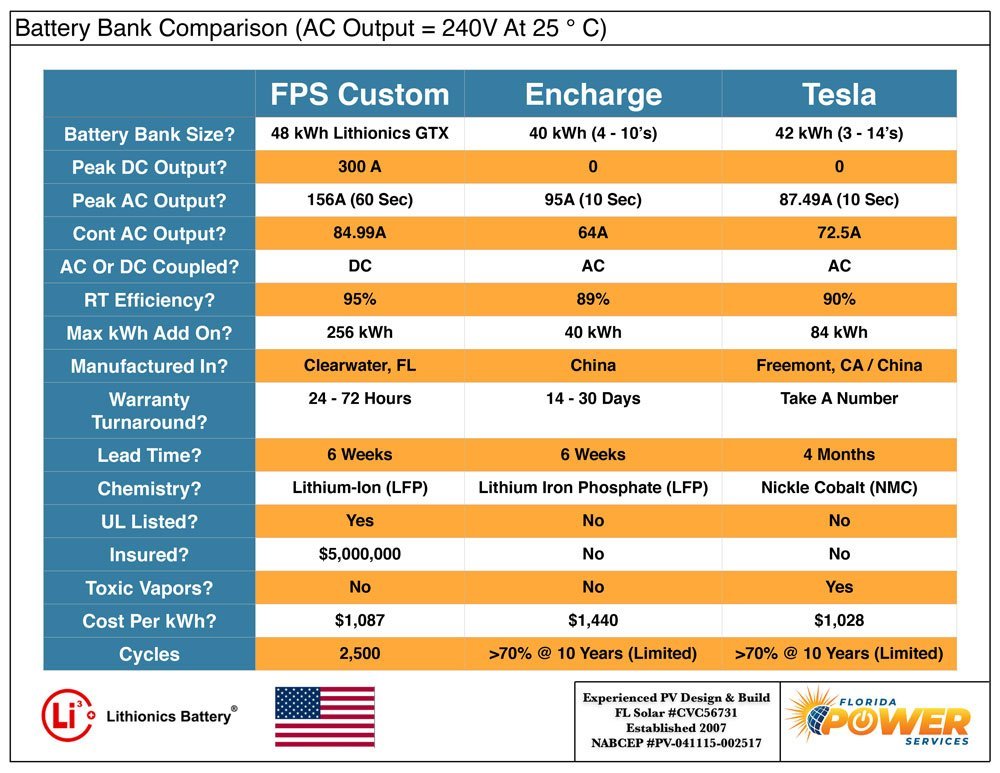 If you’re looking to install a solar with battery backup system in Florida, sizing it correctly is essential to meet your performance expectations. If you underestimate the needed kWh to power your loads through the night and you could wake up sweating in the dark – you’d rather have more battery capacity than not enough. Another key parameter to calculate is the AC output (or Amps) needed when your solar system functions in “Standalone Mode”, all batteries have different outputs with/without the grid. Proper sizing is step one of our solar consultation, next is a quality design using reputable equipment, and finally the best way to purchase.
